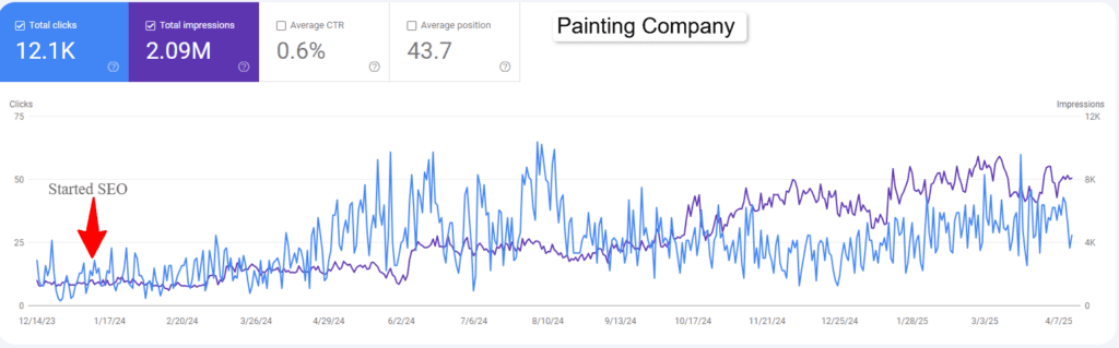 When we took over SEO management in early 2024, this established painting company was already bringing in steady business through online searches — but growth had slowed, and most traffic came from residential keywords.