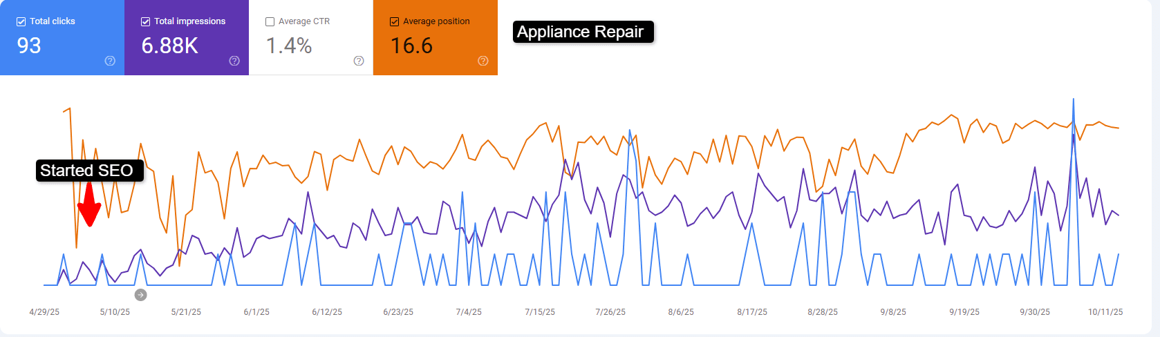 By focusing on foundational SEO and realistic service-area targeting, this new appliance repair company built strong early momentum. A consistent technical and link-building approach helped them grow authority, improve map presence, and start generating organic leads alongside their LSA campaigns.