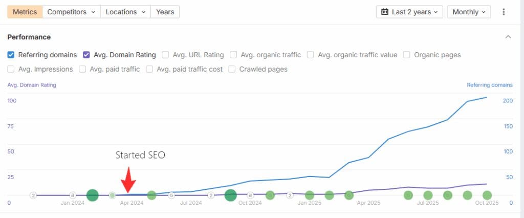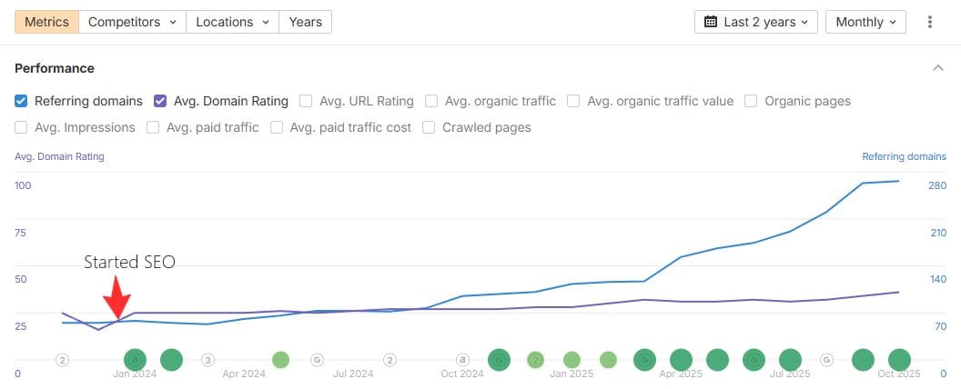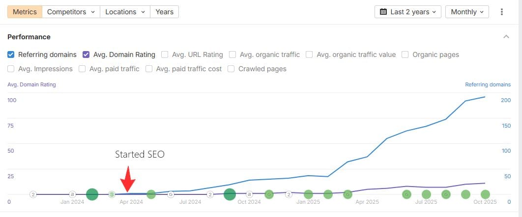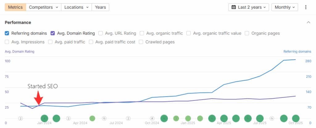Consistent backlink acquisition to grow domain authority and strengthen competitive terms.