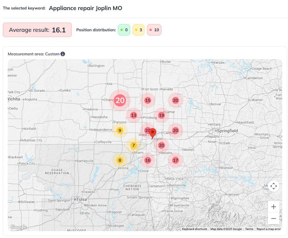 Map Ranking (Appliance Repair Joplin MO): 16.1 → 9.1 average position across 13 locations