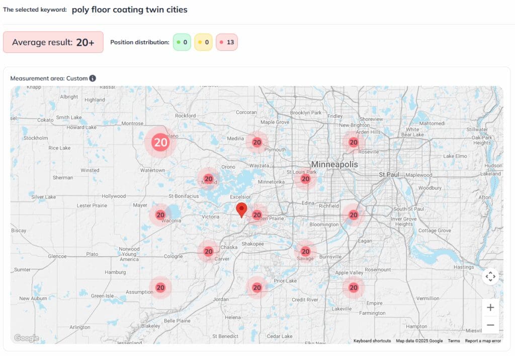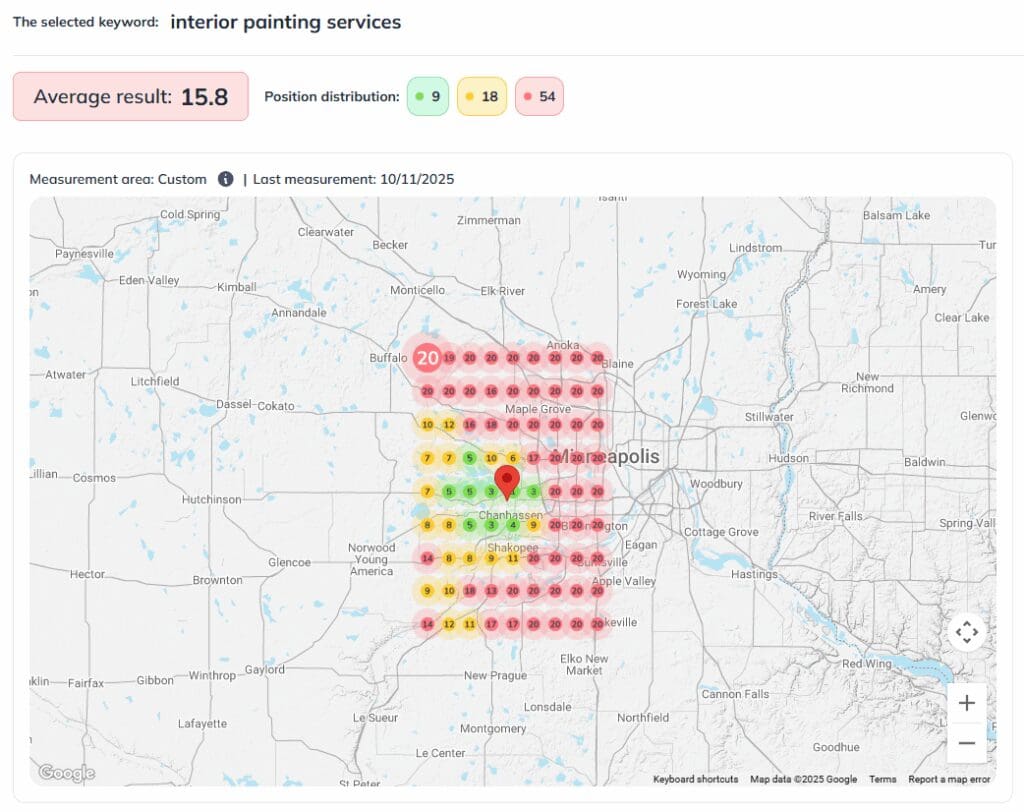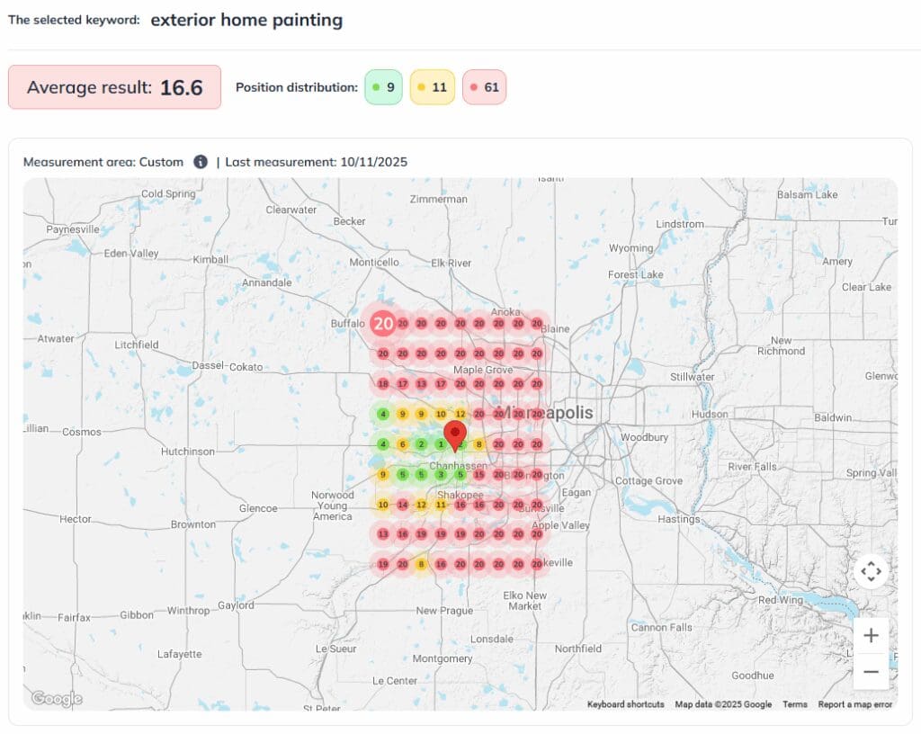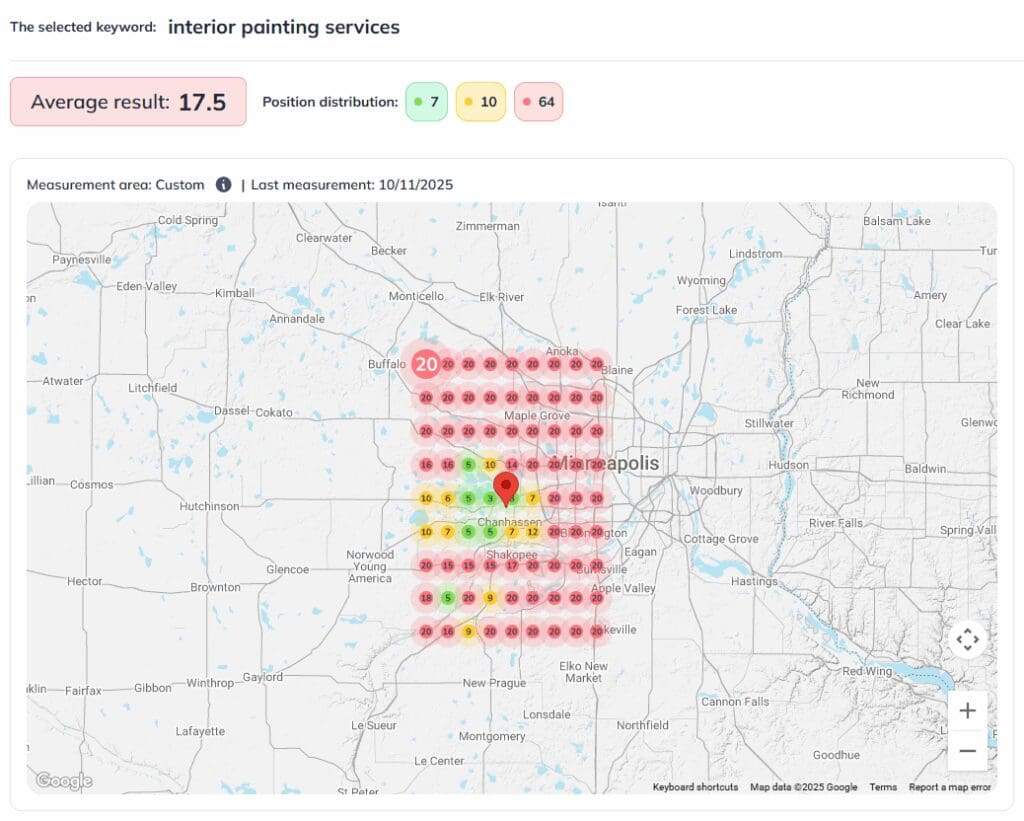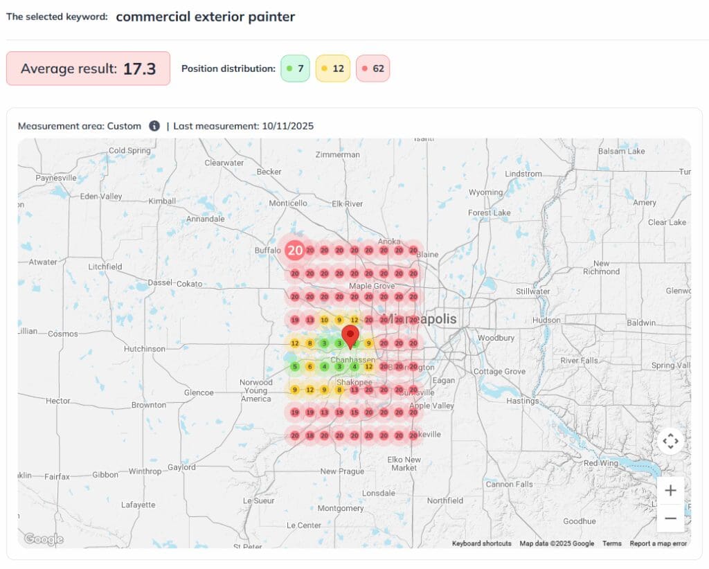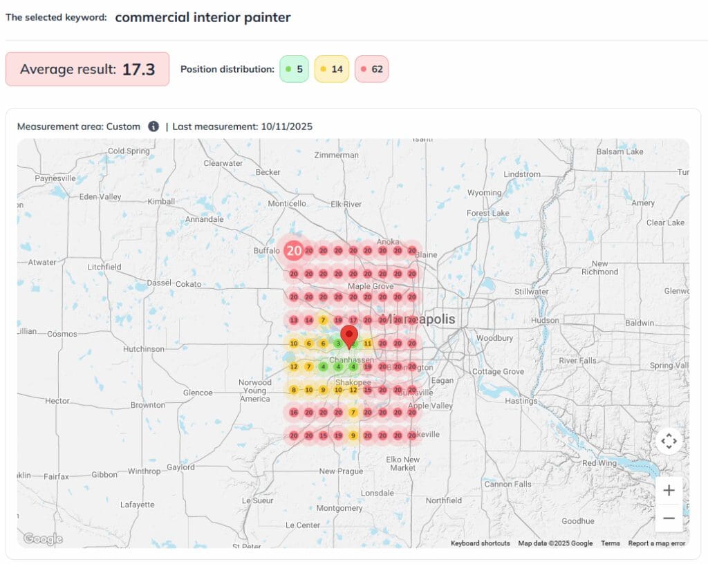 The client now ranks competitively across both Minneapolis metro and expanded surrounding areas, with visibility continuing to grow month-over-month.