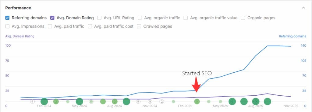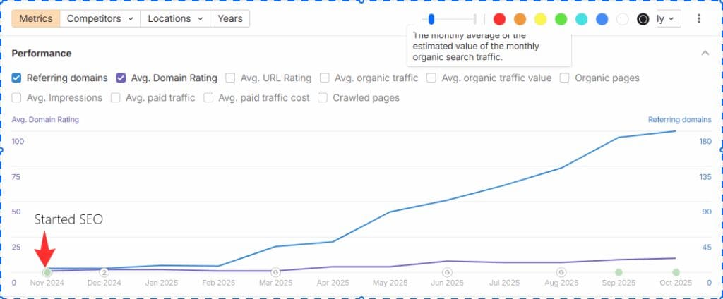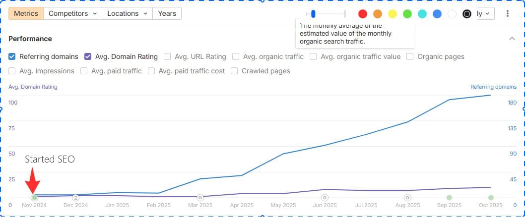 The ongoing SEO work has driven consistent growth across both authority and rankings: