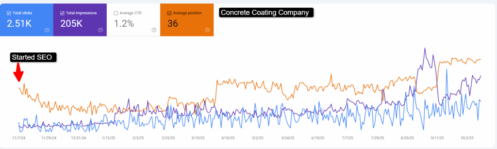 By combining structured SEO, consistent backlink building, and focused city targeting, this local concrete coating company transformed its online presence in under a year. The result: stronger rankings, higher authority, and a steady increase in organic leads across the Twin Cities market.