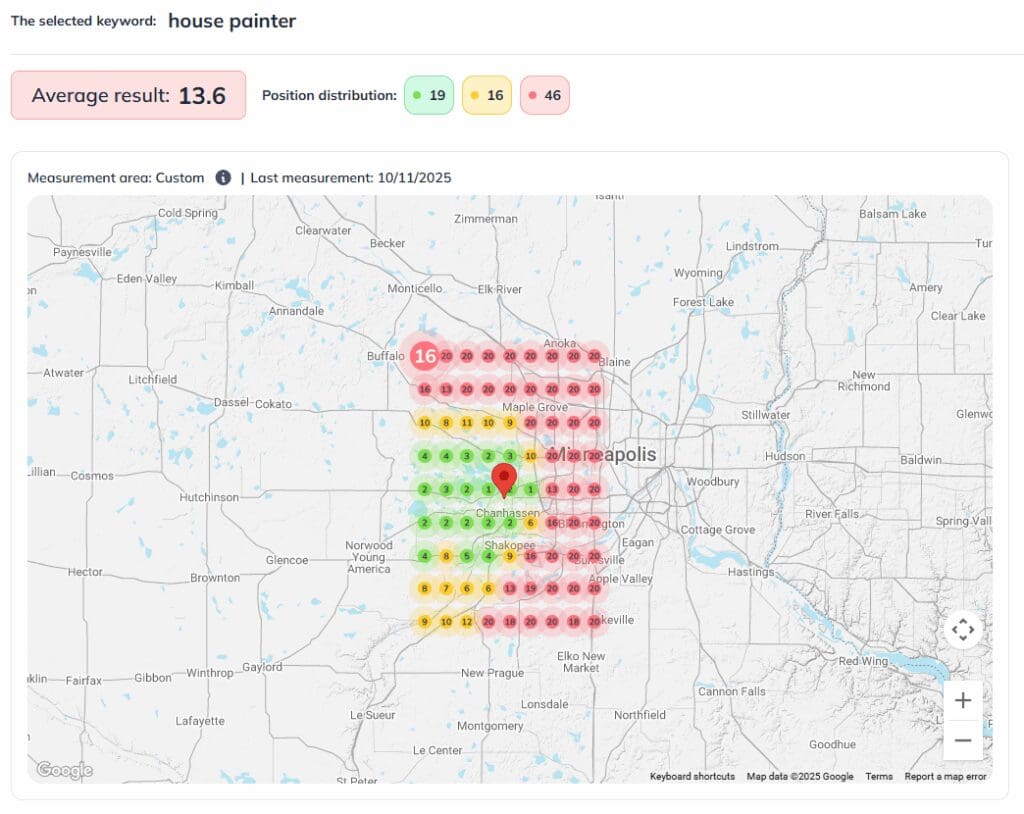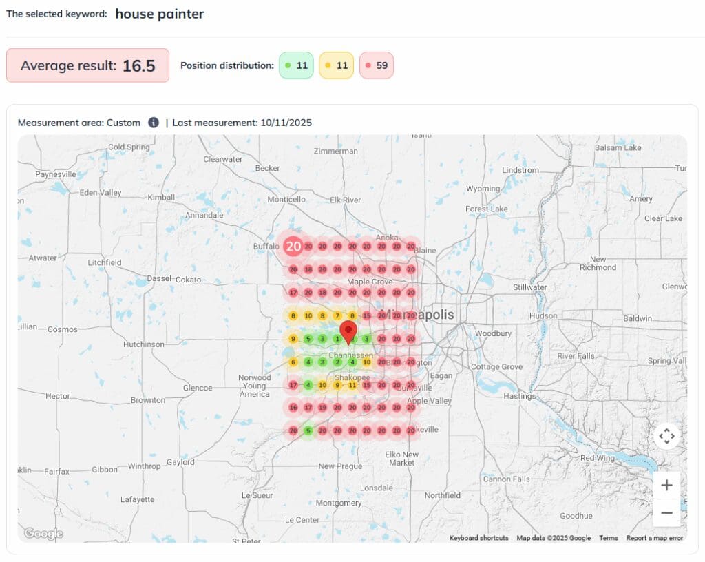 Focused map and keyword targeting on the southwest Minneapolis corridor, gradually expanding visibility north and east as rankings improved.